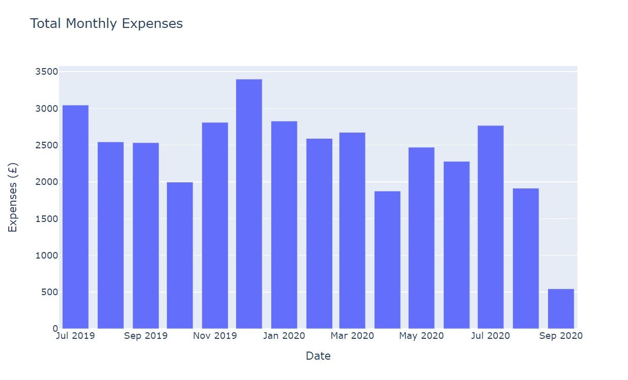 Then, by using the Plotly Express Library we can create a bar chart with Expenses on the Y-axis and Date on the X-axis.