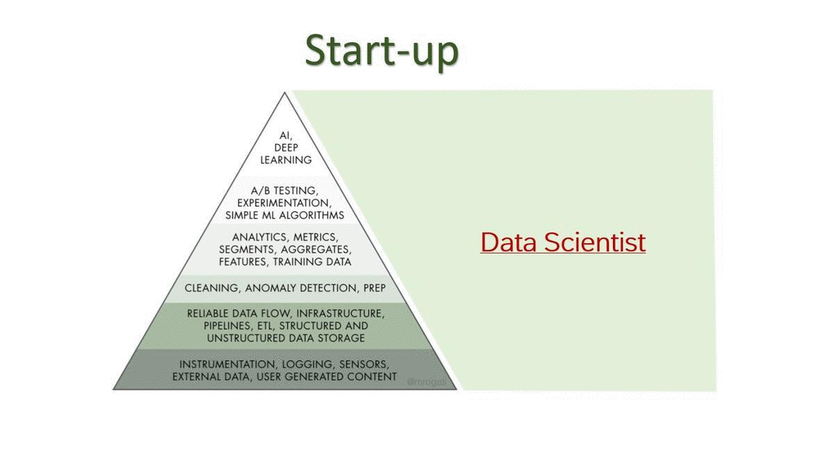 A Data Scientist working in a Start-up might have to set up the whole data infrastructure, write some software code to add logging, then do the analytics and build the metrics, and examining different solutions with A/B Testing.
