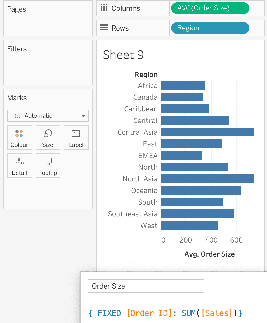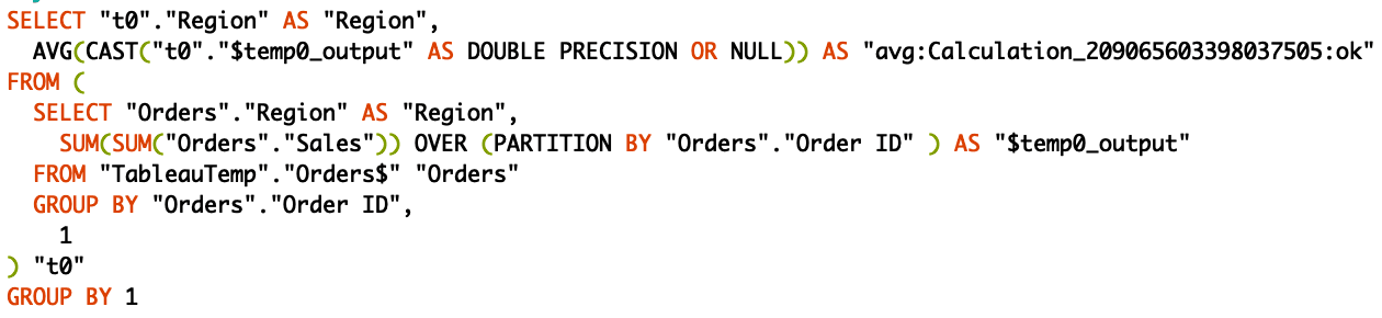 Another example I wanted to show is related to the level of detail expressions (LOD), a very powerful tool in Tableau that allows performing advanced analysis. In my case, I’m simply trying to work out the ‘Average Order Size’ in different ‘Regions’. Looking at the query that was generated in the back-end, we can see that it’s a nested SELECT statement, so we have one SELECT statement which is basically the LOD itself, wrapped around another SELECT statement.