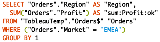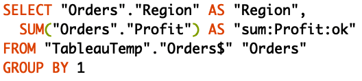 Why is this useful? Well, if you struggled to understand the difference between blue pills and green pills, you now understand how Tableau uses them differently. Indeed, when we use blue pills or dimensions (‘Region’) and green pills or measures (‘Profit’) in a view, the former will appear in the SELECT and GROUP BY statement and the latter will appear only in the SELECT statement.