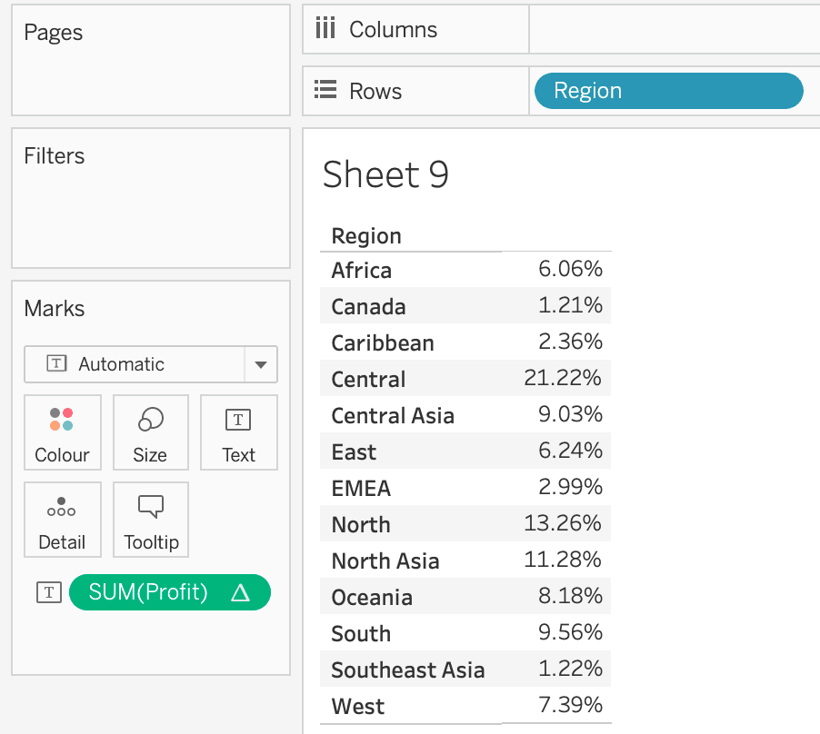 Table calculations are treated differently by Tableau. In this case, I’m looking at the ‘Percentage of Profit’ generated in different ‘Regions’. This is actually performed in Tableau since if we look at the actual query below, there is nothing mentioned in the SELECT statement to calculate the percentage of the total Profit.