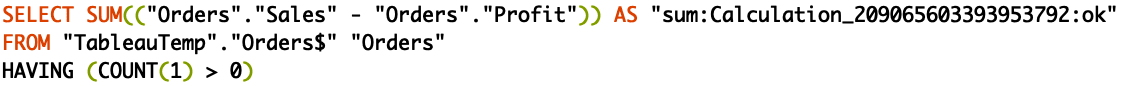 Let’s now see what happens when we use calculations. I have one prepared already which is ‘Cost’, and it is calculated as ‘Sales’ – ‘Profit’. As you can see below, this calculation is actually pushed and performed by the database and Tableau just gets the result back and visualises it in the front end.